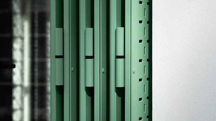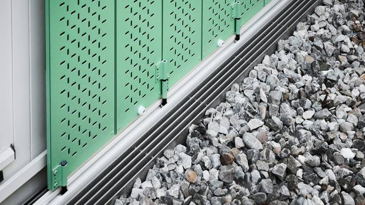 Auch das Führungssystem ist maßgeschneidert. Dank einer zusätzlich unten angebrachten Magnetleiste können die Elemente in jeder beliebigen Position zwischen vollständig geschlossen und geöffnet arretiert werden. Das beliebig dreh- und spiegelbare Perforationsmuster konnte auf jedem Faltladenblatt zentriert werden und ermöglichte so eine kosteneffiziente Produktion individueller Formate.