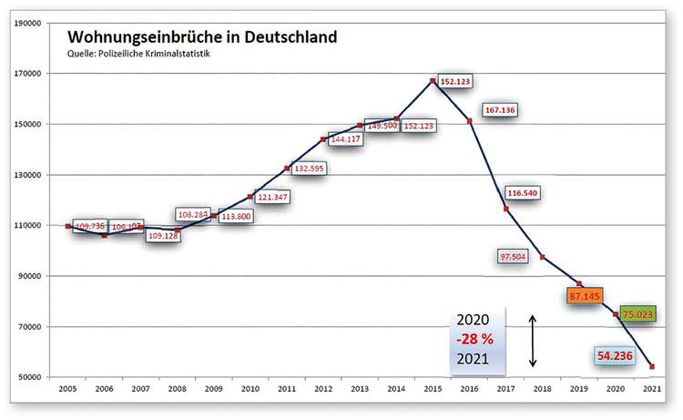 Seit 2016 ist die Zahl der durch die Polizei registrierten Einbruchsdelikte rückläufig, so auch im Jahresvergleich 2020/21. Bei der Diebstahlskriminalität ist ein Rückgang um 12% auf 1.483.566 Fälle zu verzeichnen, beim Wohnungseinbruchdiebstahl sogar um 28%. Bundesinnenministerin Nancy Faeser meint, dass das an der verbesserten Aufklärung liege: „Die Kriminalstatistik zeigt in den meisten Bereichen eine positive Entwicklung. Die erneut gestiegene Aufklärungsquote zeigt, dass sich die Stärkung der Polizei auszahlt.“ Trotz der abnehmenden Zahlen sieht Ministerin Faeser eine weiterhin große Aufgabe zu bewältigen: „Wohnungseinbruchdiebstahl ist und bleibt ein aktuelles Thema. Die Sicherheit in den eigenen vier Wänden ist für uns alle von besonderer Bedeutung.“