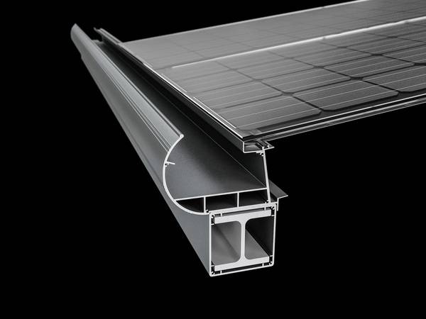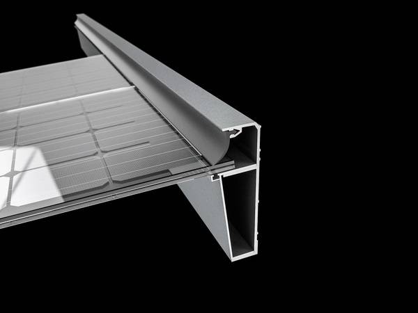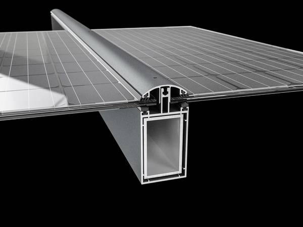Mit speziell gefertigten Klemmprofilen werden die Module befestigt. Dabei wird für die Auflagen ein geprüftes EPDM-Fabrikat eingesetzt, um Verfärbungen der Module vorzubeugen. Denn Gummi kann in Wechselwirkung mit den Glas-Glas-Modulen über die Jahre zu unschönen Verfärbungen an den Rändern der Module führen. Das Regenwasser wird über die unteren Module in eine Regenrinne abgeführt. Dabei ragen die Modulkanten wenige Zentimeter über die Auflagefläche hinaus und in die Regenrinne hinein. Von dort fließt das Wasser über ein im Pfosten integriertes Fallrohr ab.