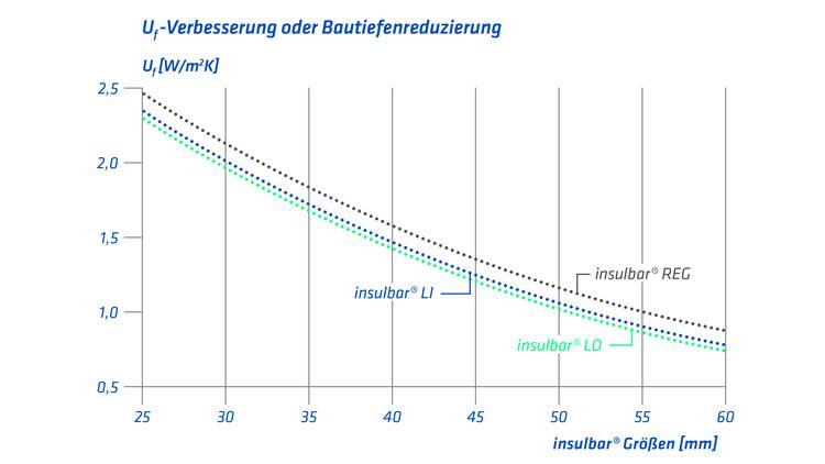 Abhängig vom Ausgangssystem lassen sich durch die Umstellung auf Insulbar LI die Uf -Werte um etwa 0,1 W/m2K reduzieren. Bestehende Fenstersysteme können so durch einen Wechsel zu Insulbar LI wärmetechnisch einfach verbessert bzw. in zusätzlichen Varianten mit unterschiedlichen Uf -Werten angeboten werden – ohne weitere System- oder Prozessveränderung.