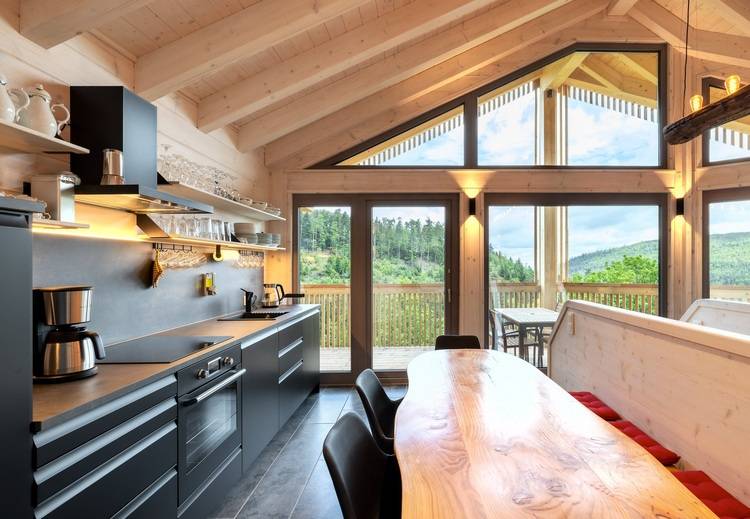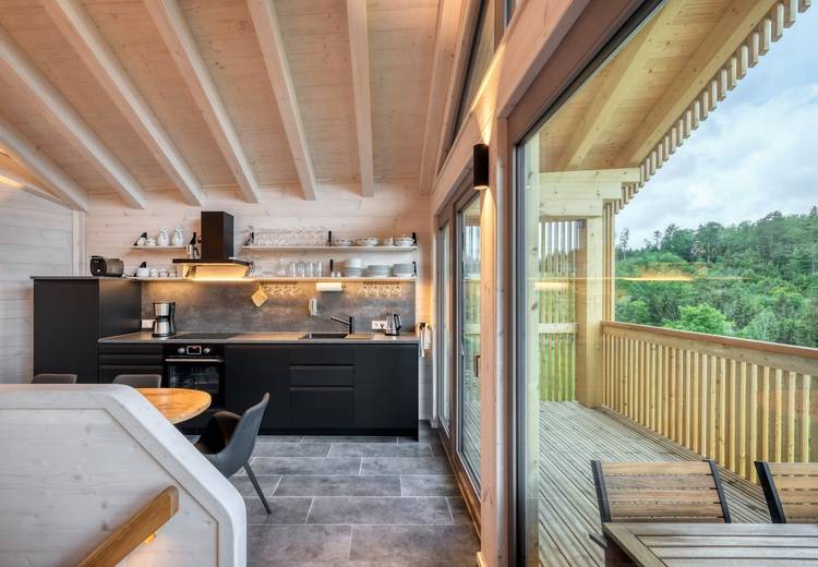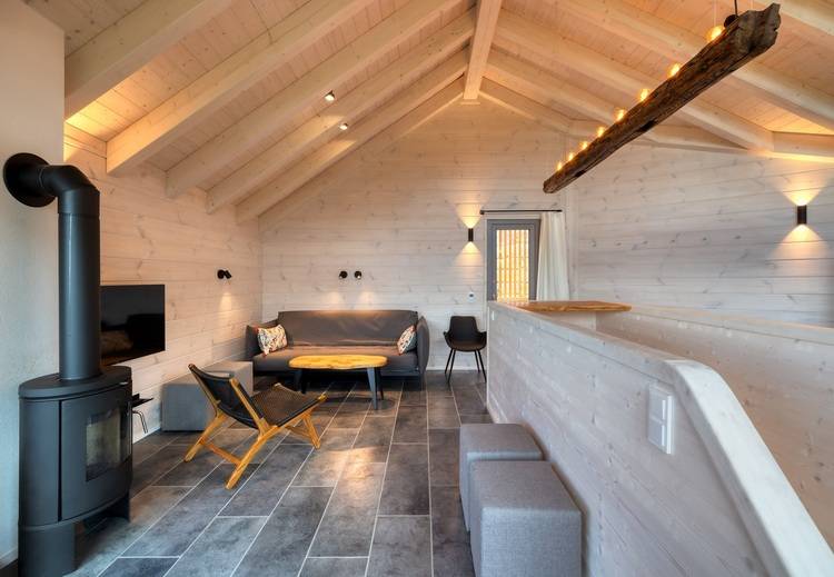 Die Bauweise mit massiven Holzwänden aus Kieferblockbohlen reflektiert die traditionelle Handwerkskunst der Region, während das Gesamtkonzept der Häuser eine innovative Architektur, nachhaltige Bauweise und durchdachte Raumgestaltung verkörpert. Als Highlight fungiert die Panoramasauna, die mit ihrer fassähnlichen Gestaltung über dem Tal schwebt. Ein angrenzender Ruheraum, ein Bad und eine Außendusche runden das Saunaerlebnis ab.