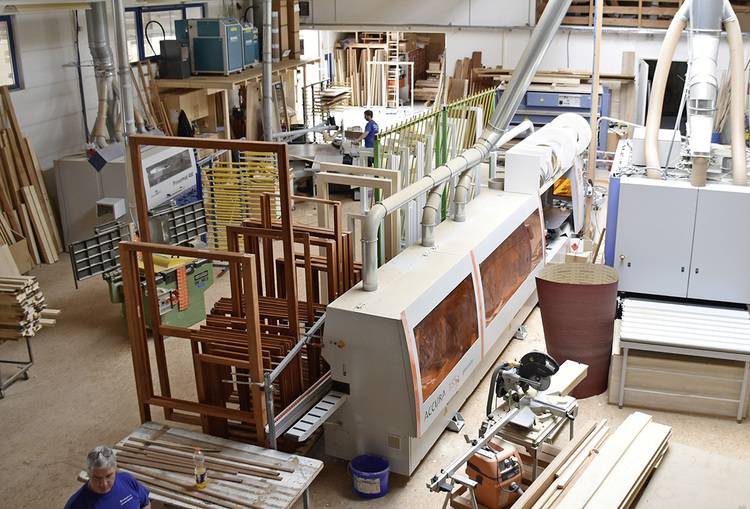 Wenn man auf das leidige Lieferketten-Thema zu sprechen kommt, zeigt sich die große Bandbreite der aktuellen Herausforderungen: Meinzinger hat so gut zu tun wie schon lange nicht mehr, und glücklicherweise verfügt er über ein umfangreiches Holzlager. So konnte er sich etwas abkoppeln vom überhitzten Holzmarkt. Aber in der Produktion muss man immer wieder improvisieren – beispielsweise wenn Würth mit den Spezial-Schrauben für die Beschlagsmontage-Automaten nicht rechtzeitig nachkommt.