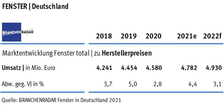 Entgegen den Befürchtungen des Branchenverbandes gegen Mitte des vorigen Jahres brach der deutsche Fenstermarkt im Jahr 2020 keineswegs ein. Laut aktuellem Branchenradar Fenster in Deutschland wuchs die Nachfrage vielmehr um 1,1 Prozent gegenüber Vorjahr. Die Erlöse der Fensterhersteller stiegen sogar um 2,8 Prozent gegenüber Vorjahr auf insgesamt 4,58 Milliarden Euro.