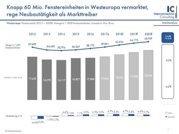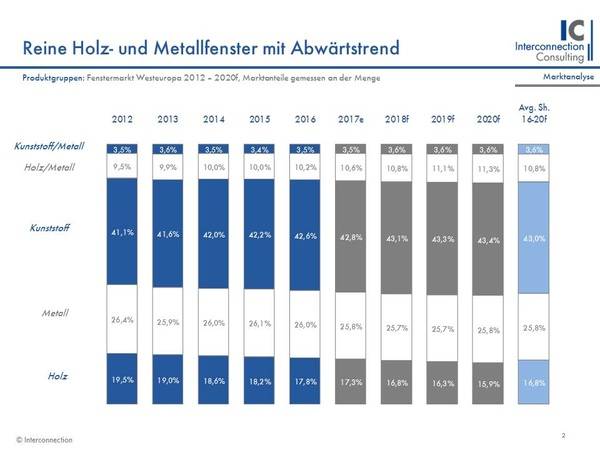 Bis 2020 wird ein moderater Anstieg (+3.2% nach Menge pro Jahr, +4.2% in Wert pro Jahr) für die Branche erwartet. Interconnection Consulting zeigt in der neuen Studie auch, dass das reine Kunststoff- und die Materialkombination Holz-Aluminium überproportional profitieren dürfte.