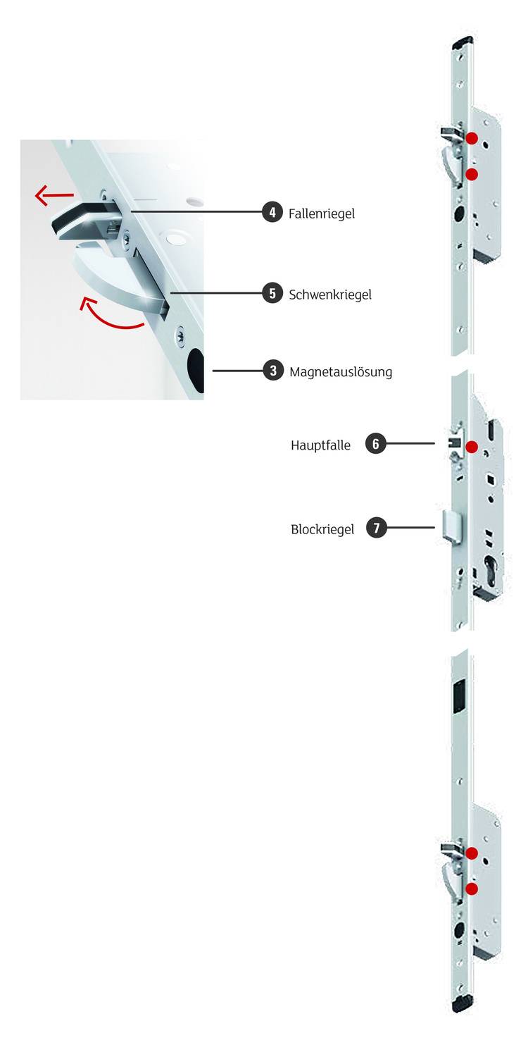 Die Stulp- und die durchgehende Schließleiste des Automatikschlosses sind aus besonders robusten Edelstahl. Wenn die Tür ins Schloss fällt, werden Magnetkontakte oben und unten ausgelöst. Diese aktivieren jeweils einen Fallenriegel und einen Zirkelriegel, die die Haustür bereits effektiv sichern. Der fünfte Verriegelungspunkt ist die Hauptfalle auf Höhe des Türgriffes. Von Innen kann die Automatik durch Herunterdrücken des Türgriffes einfach geöffnet werden. Dadurch werden alle fünf Verriegelungspunkte mechanisch in ihre Ausgangsposition zurückversetzt.