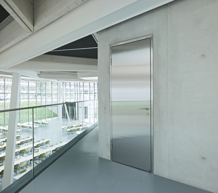 Dort, wo es neben Brandschutz auch auf Hygiene oder ein anspruchsvolles Türdesign ankommt, können die Blockzargen und Türen in Edelstahlausführung eingesetzt werden. Die sind besonders korrosionsbeständig und langlebig.