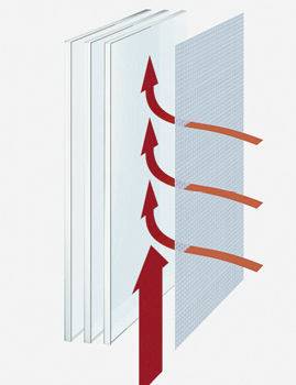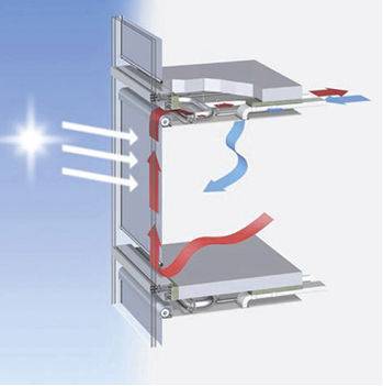 Der Luftstrom, der so an der Verglasung und dem Tuchbehang vorbeistreicht und in etwa Raumtemperatur hat, kühlt damit die Oberflächen und saugt den im Zwischenraum entstandenen Wärmestau nach oben durch die Decke ab. Dadurch wird verhindert, dass die durch Absorption der Sonnenstrahlung entstandene Wärme durch Konvektion und Strahlung in den Raum abgegeben wird. Eine niedrig emittierende Schicht auf der Innenseite des Stoffes kann diesen Effekt unterstützen. Durch die Öffnungen im Gewebe wird ebenfalls ein Teil der Abluft angesaugt, was zu einer zusätzlichen Kühlung der Gewebeoberfläche führt. Der Nutzer kann die Höhe des Sonnenschutzbehangs abhängig vom Grad der Blendung individuell einstellen, ohne dass eine wesentliche Beeinträchtigung in der Funktion des Systems entsteht.