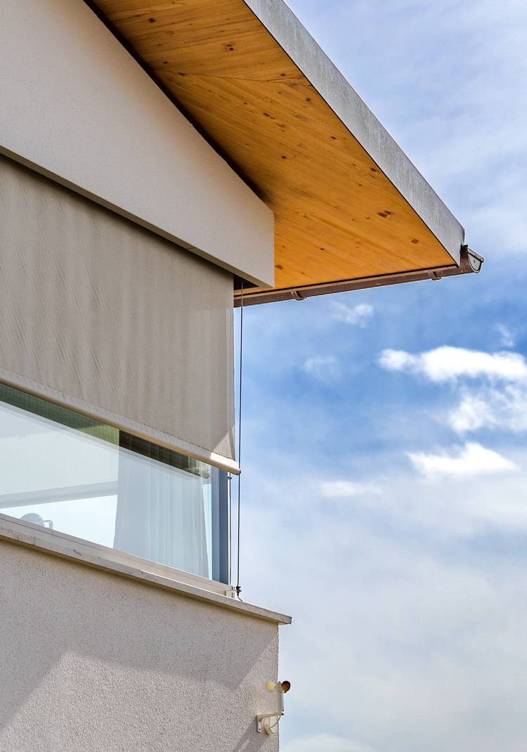 Den gemütlichen und halboffenen Innenhof des an einen Hang gebauten Architektenhauses begrenzt an zwei Seiten die großflächige Fensterfront des Erdgeschosses, zu dessen Highlight zweifellos die Ganzglasecken zählen. „Bei einem so hohen Glasanteil spielte natürlich der Sonnenschutz eine große Rolle. Zugleich sollte die Technik zur Verschattung der Fenster nicht sichtbar sein, aber auch an den Ganzglasecken angebracht werden können. Mit den maßgefertigten Jalousiekästen von Joma konnten wir diese Ansprüche einwandfrei erfüllen“, sagt Christiane Maucher, und führt weiter aus: „Bei einem herkömmlichen Jalousiekasten muss zwischen dem Rohbau und dem Schacht per Hand gedämmt werden. Oft schleichen sich dabei aber Fehler ein und kostspielige Schäden entstehen. Die Joma-Lösung kommt dagegen fix und fertig und ringsum gedämmt auf der Baustelle an und kann unkompliziert montiert werden. Das reduziert Wärmebrücken auf ein Minimum“.