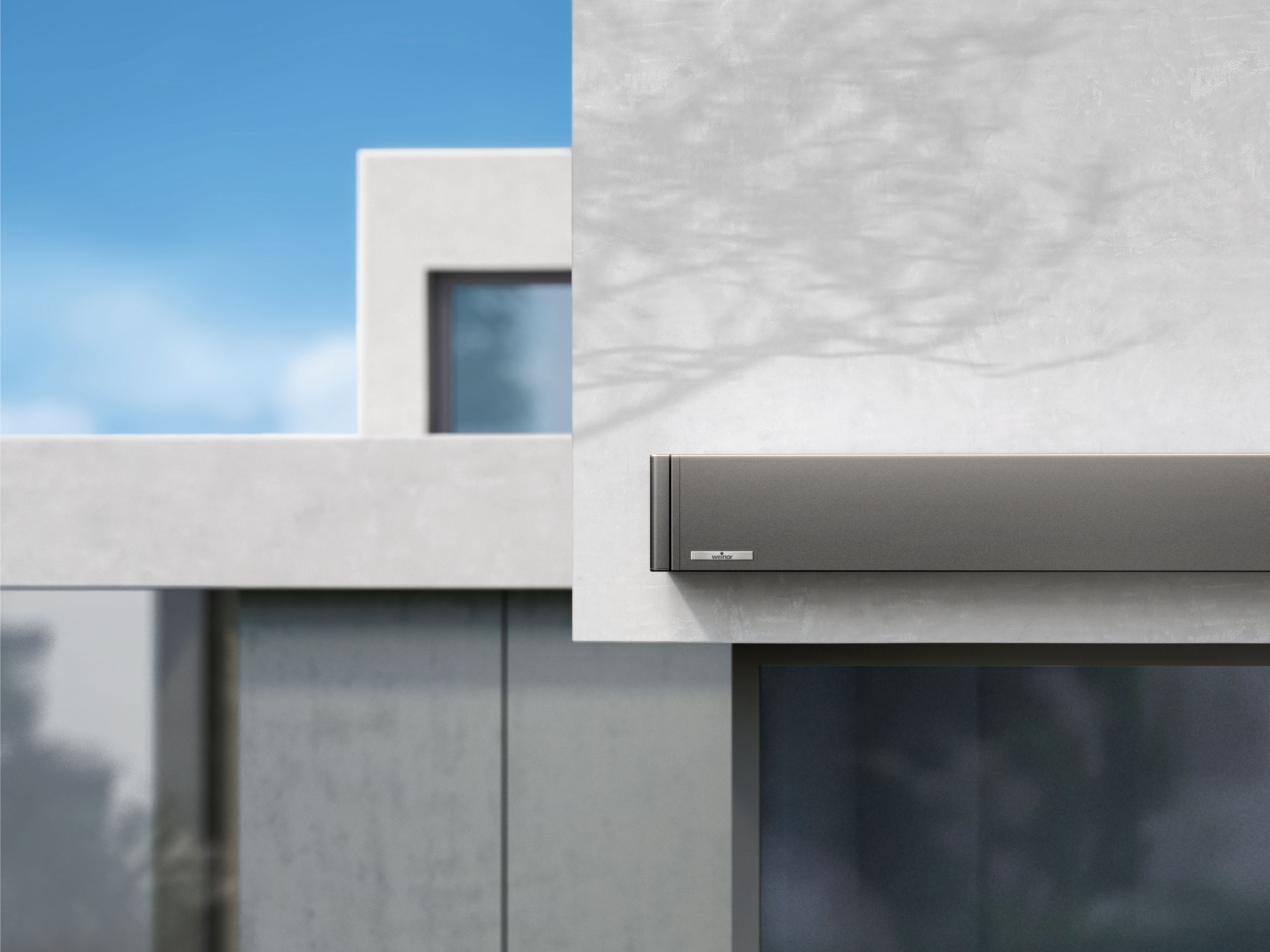 Geschlossen zieht die Markisen-Kassette mit ihrer nahezu quadratischen Form klare Linien am Gebäude. Die homogene Form der Kubata wird durch ihre glatten, schraubenlosen Oberflächen betont.