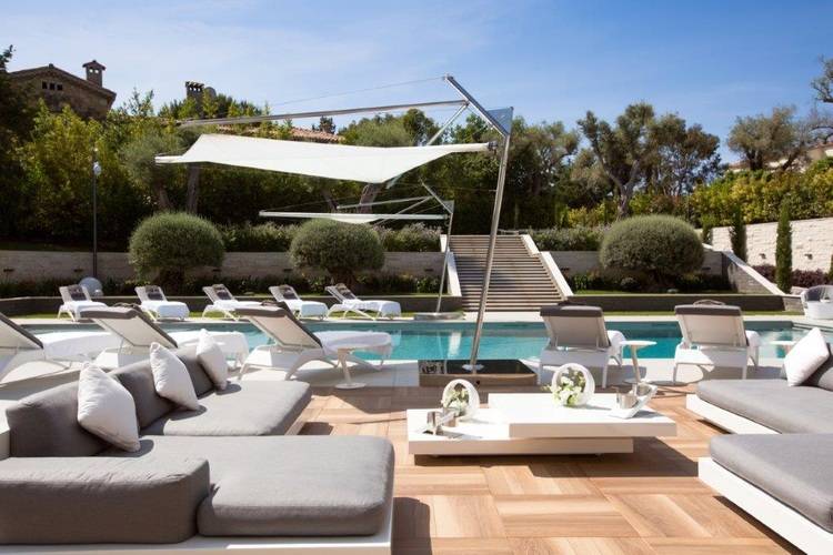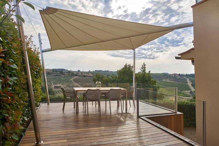 Das große Sonnensegel Kheope zeichnet sich durch ein leichtes, modernes Design aus. Es ist optional mit einer motorisierten Bedienung und einem Windmesser erhältlich, der das Segel bei starken Winden automatisch schließt.