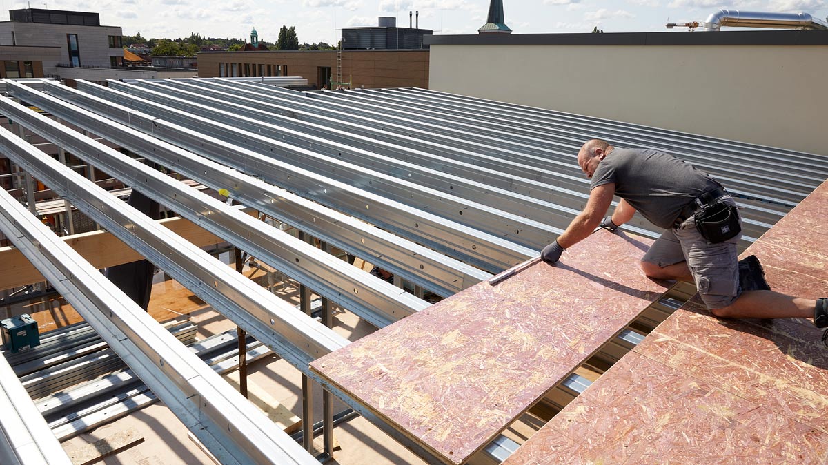 Für die Deckenkonstruktion wurden die Stahl-Leichtbauprofile mit einer Lage OSB-Platten belegt auf die dann zweilagig Knauf Brio Fertigteilestrichelemente mit Trittschalldämmung verlegt wurden.