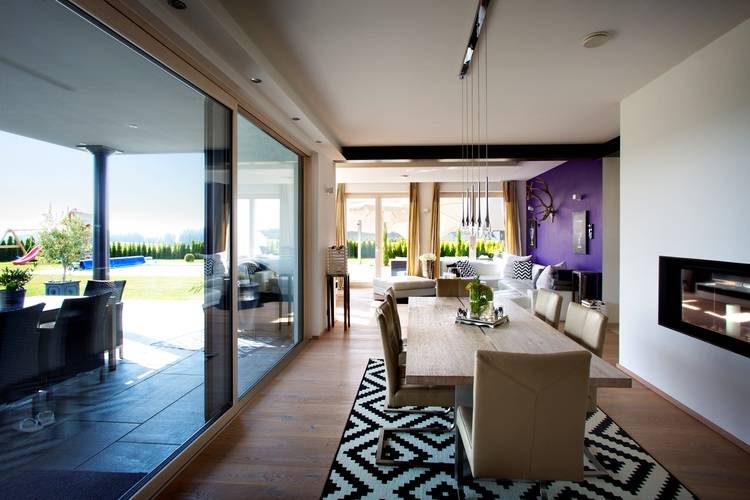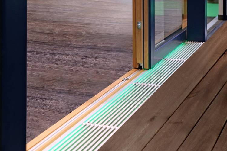 Eine elegante Nullbarriere-Schwelle erweitert den Wohnraum bodenbündig nach draußen. Optional lässt sich auch eine schmale Lichtleiste in die Bodenschwelle integrieren.
