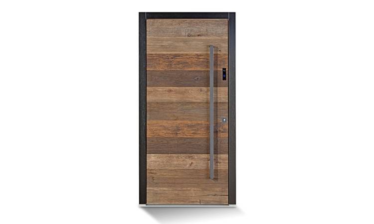 Allein von der Natur gestaltet - das Holz wurde sorgfältig aufbereitet - verwandelt die Haustür den Eingangsbereich in einen Blickfang. Der urwüchsige Charakter kommt besonders gut bei moderner Architektur zur Geltung. Zum Erscheinungsbild trägt ein Stoßgriff in Schwarzstahl-Optik bei, intelligente Zutrittssysteme sorgen für Sicherheit.