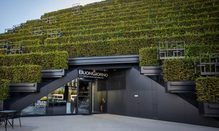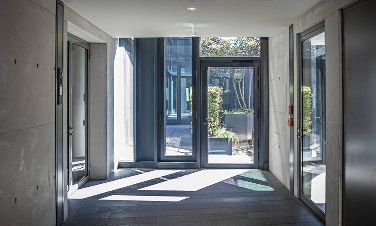 Dank ihrer geringen Antriebshöhe von nur 7 cm waren die Slimdrive Schiebetürsysteme hierfür die perfekte Lösung: Sie fügen sich dank ihrer geringen Bauhöhe in die begrünte Fassade ein. So kam an winkeligen Fassaden oder Ecken, beispielsweise am Pavillon sowie am Tiefgaragen- und Gastronomiezugang, Slimdrive SLV zum Einsatz – objektspezifisch projektiert und mit dem zum Projekt passenden Winkel in der Antriebsschiene eigens hergestellt.