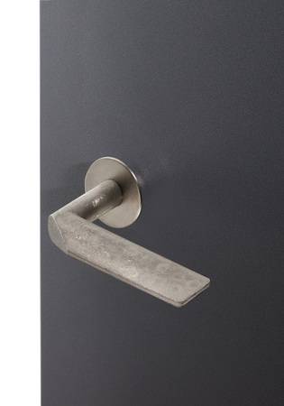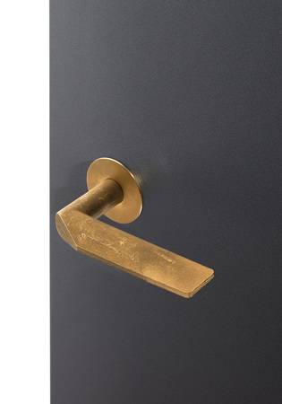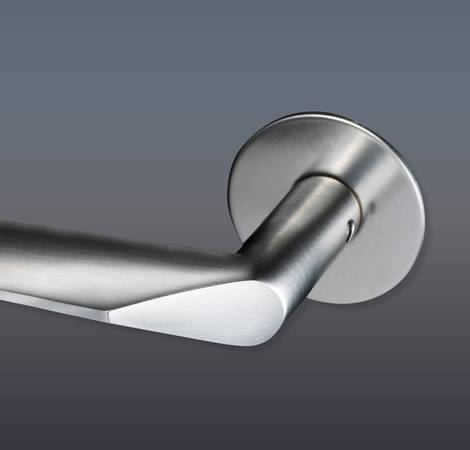 Darüber hinaus ist der Komé-Drücker mit auf dem Türblatt aufgesetzter Rund- oder Ovalrosette in diversen Oberflächen, wie Edelstahl matt gebürstet oder auf Anfrage beispielsweise als rohe Edelstahl- oder Messing-Oberfläche, erhältlich.