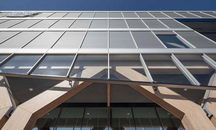 „Durch die Entscheidung für einen außen liegenden Sonnenschutz hatten wir die Möglichkeit, eine weitgehend transparente Fassade zu gestalten, bei der die innenliegende Holzkonstruktion für die Umgebung sichtbar bleiben konnte“, erklärt Architekt Roderik van der Meulen. „Ausgehend von dem Wunsch nach einem robusten, vielfach bewährten und optisch möglichst schlichten System, das sich optisch gegenüber der Konstruktion zurücknimmt und das sich direkt in die Fassade integrieren lässt, sind wir dann schnell auf das System CSB von Schüco gestoßen, das letztlich das einzige integrierte System am Markt ist. Ganz wichtig war uns andererseits, dass wir das System in einem Testaufbau begutachten konnten und dass sich die Gesamthöhe und -tiefe des Systems an die Abmessungen der Geschossdecken anpassen ließen.“
