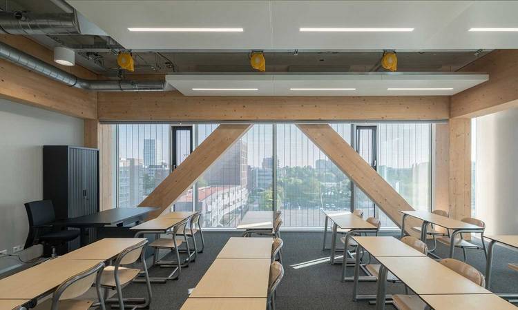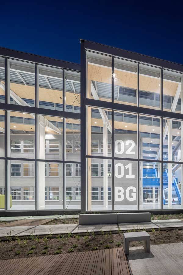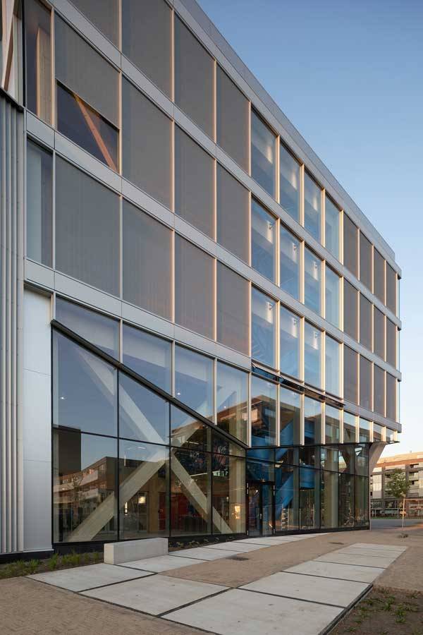 Charakteristisches Element der Architektur ist die schlank profilierte, mit dem System Schüco FWS 50 umgesetzte Pfosten-Riegel-Fassade, die den Blick auf die hölzerne Tragstruktur und die leuchtend-blau gestalteten Treppenanlagen im Gebäude freilegt. Die Hülle setzt sich zusammen aus 2 x 3,60 Meter großen Feldern mit jeweils 32 Millimeter dicker Dreifachverglasung, die aus psychologischen Gründen zu einem Teil mit manuell öffenbaren Lüftungsflügeln ausgestattet sind: „Die Konstruktion ermöglicht eine maximale Transparenz und verweist gleichzeitig auf das Thema 'Nachhaltigkeit' und die hohe Qualität der technischen Ausbildung vor Ort“, erklärt Projektarchitekt Roderik van der Meulen.