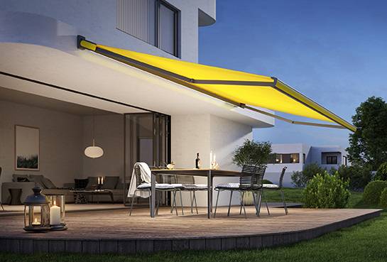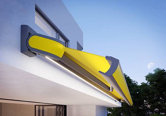 Die schlanke Form fällt außerdem dadurch ins Auge, dass die neu entwickelten Wand- und Deckenhalter die Markise ganz außen am Kassettenkorpus tragen. Die Halter sind durch Kappen verdeckt, die optisch mit der Markise verschmelzen. Ein weiteres, das Design betonende Element ist ein neues Lichtsystem, das in einer Multifunktionsnut unter dem Gehäuseprofil angebracht ist. Hieran lässt sich eine LED line befestigen oder mehrere LED Spots - beides per io-Funktechnik dimmbar. Sie beleuchten die Kassette und die Fassade am Abend mit einem schmalen Lichtband oder mit akzentuierenden Lichtkegeln.