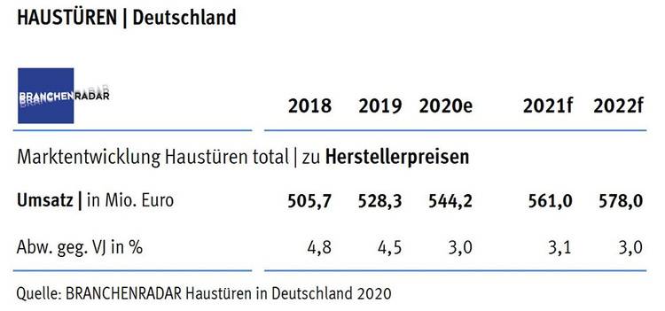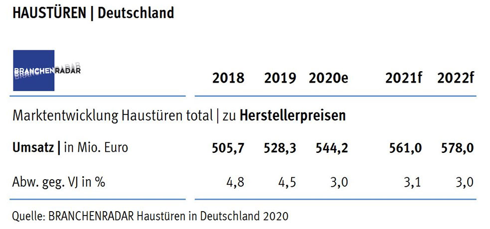 Auch in den beiden kommenden Jahren können die Hersteller von Haustüren mit einem stabil wachsenden deutschen Markt rechnen. Bis 2022 prognostiziert Branchenradar.com ein erlösseitig jährliches Wachstum von rund drei Prozent. Es sein denn, Corona beschäftigt uns dauerhafter und umfangreicher als aus heutiger Sicht angenommen.