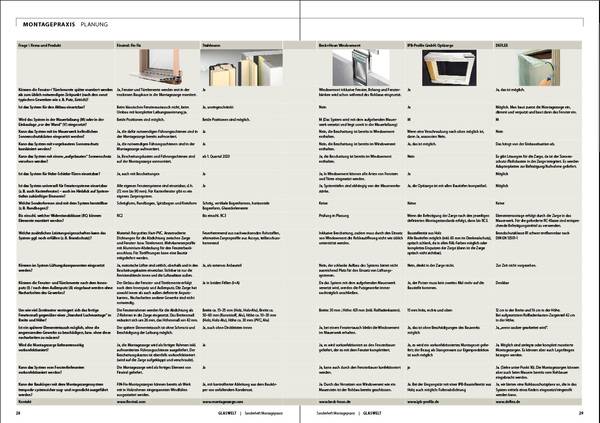 Insgesamt soll also den Markt von „Montagezargen“, als auch von „Hilfskonstruktionen für die Montage“ beleuchtet werden. In der Übersicht im PDF wurden die wesentlichen Fragestellungen zu den am Markt erhältlichen Montagesystemen einiger Systemgeber abgefragt.