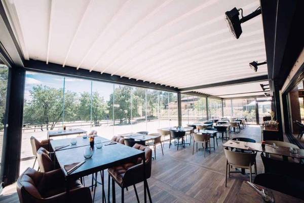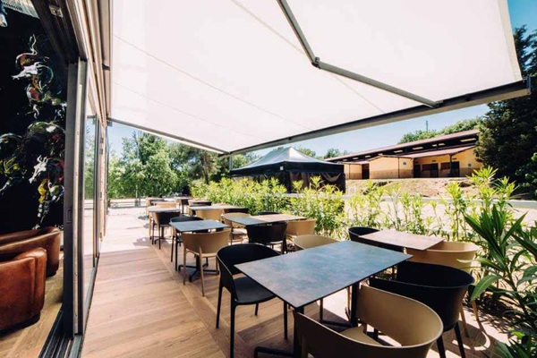 Inmitten der Anlage hat das Restaurant Le Paddock, das sich dem Pferdesport widmet, seinen Standort und serviert seinen Besuchern, die vom naheliegenden Reiterhof kommen, regionale Spezialitäten. Der Restaurantbesitzer wünschte sich eine Lösung, mit der Le Paddock um einen neuen Dining-Bereich im Freien reicher würde.