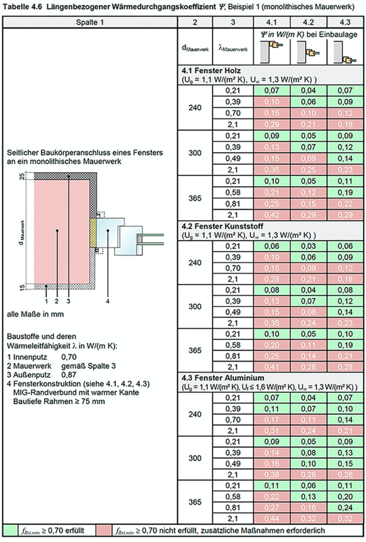 Aufgrund der hohen Bedeutung dieser Thematik wurden alle Tabellen (Wärmebrückenkatalog) nach den aktuellen Normen neu berechnet und überarbeitet. Neu hinzugekommen sind Tabellen zur Ermittlung der Psi-Werte (Ψ) sowie die Möglichkeit, verschiedene Parameter zu bewerten, beispielsweise die Ausführung der Überdämmung und der Dämmung zweischaliger Mauerwände. Mit Hilfe der Musterdetails und der Tabellen können Planer, Fensterhersteller und Monteure Kennwerte ermitteln, die z. B. auch für die Erstellung eines Gebäude-Energieausweises genutzt werden können. In Kapitel 8 wurden für alle Musterdetails die wärmetechnischen Berechnungen (Isothermen, Psi-Werte, fRsi) gemäß den normativen Änderungen neu ausgeführt.