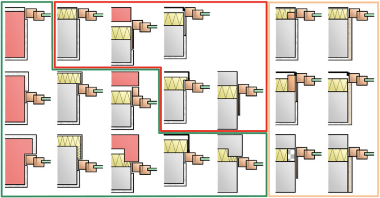 Für die Fugenausbildung gilt als Faustformel, dass das Fugenschalldämm-Maß um mindestens 10 dB höher liegen sollte, als die geforderte Schalldämmung des Bauteils, um die eingangs genannte „1-dB-Regel“ erfüllen zu können. Bei schalltechnisch kritischen Einbausituationen gemäß DIN 4109-2, Kap. 4.4.4 (in Bild 7 rot eingerahmte Einbausituationen), wird der Planer im Besonderen gefordert. Es ist ein planerischer Nachweis der Einbausituation erforderlich und es sind hier ggf. besondere Maßnahmen zu planen und entsprechende Vorgaben zu machen. Der Montageleifaden erklärt deshalb ausführlich das Nachweisverfahren und enthält auch eine Tabelle zur Ermittlung der Fugenschalldämmung.