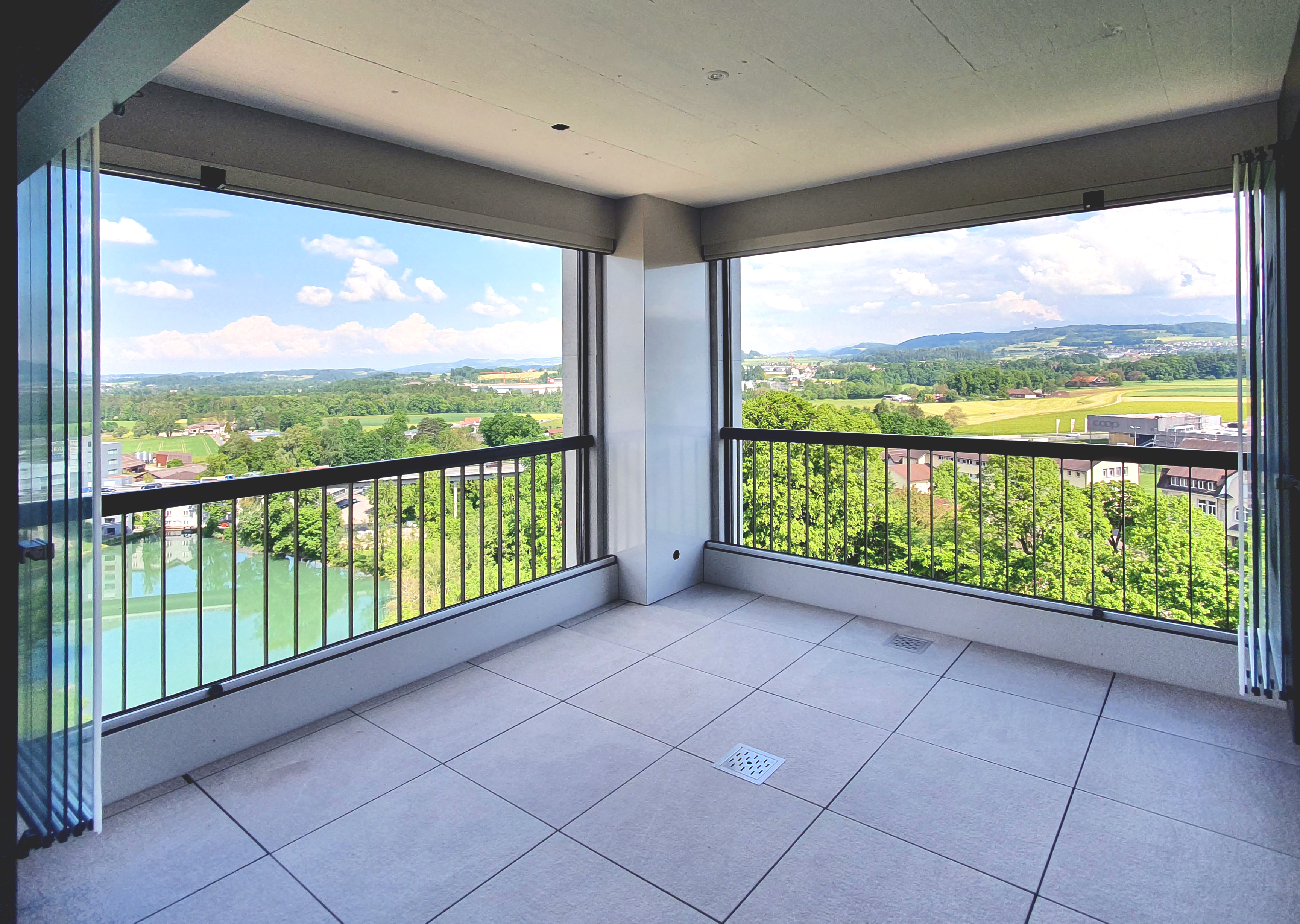 In einem markanten Gebäudekomplex nahe Luzern können Bewohner idyllisches Schweizer Bergpanorama ganzjährig vom Balkon oder der Loggia ihrer neuen Wohnungen aus genießen. Möglich machen es die Verglasungen der Außenbereiche: Sie schirmen Nässe und Wind zuverlässig ab, reduzieren Schall und andere Emissionen, zugleich verbessern sie die Wärmedämmung und damit die Energiebilanz der Wohnungen. Auch optisch harmonieren die nordisch-puristischen Verglasungssysteme von Lumon mit dem modernen Fassadendesign der beiden auffallenden Neubauten, die in 2021 fertiggestellt wurden.