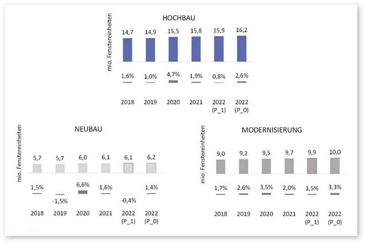 Diesmal wurde die Prognose auf der VFF-Fachtagung Statistik und Markt am 3. Mai 2022 in zwei Erwartungshorizonte eingeteilt. Ein Wachstum von 2,6 % liege im Bereich des Möglichen, dann müsse aber auch der weitere Jahresverlauf günstig verlaufen und die Ukraine-Krise sich ebenfalls nicht gravierend auswirken. Sollte aber die Inflation und die damit zusammenhängenden Baugeldzinsen in Q2 noch stärker ausschlagen, trauen die Analysten dem Fensterabsatz 2022 nur noch einen geringen Wachstumsausschlag von 0,8 % zu.