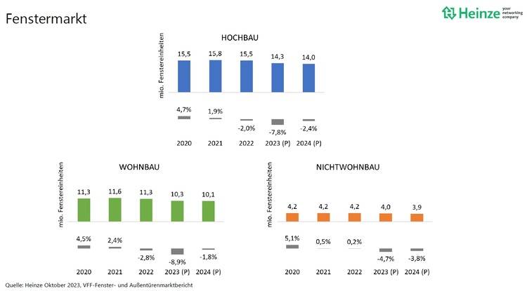 Im Rahmen der Fachtagung „Statistik und Markt“ des VFF in Frankfurt wurden am 19. Oktober 2023 die Prognosen für die Fenster- und Außentürenmarktzahlen für 2023 und 2024 von Jörg Flasdieck von der Heinze Marktforschung GmbH vorgestellt. Gemeinsam mit der Heinze Marktforschung GmbH werden die Daten erhoben von den Branchenverbänden Fenster + Fassade (VFF), Bundesverband Flachglas (BF), pro-K sowie Fachverband Schloss- und Beschlagindustrie (FVSB). Die aktuellen Daten zeigen im Wohnungsbau, dass die Fenstersanierung 2023 um 1,5 % zurückgeht (entgegen der bisherigen Erwartung eines Wachstums von 0,8 %) und 2024 wieder um 1,7 % zunehmen wird auf dann 7,19 Mio. FE.