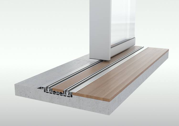 Die Laufschiene der dreispurigen Variante wird nicht zur Stolperfalle: Als Einlegeprofil zwischen den Schienen kann ein Aluminiumprofil, eine Holzleiste oder auch ein Fliesenbelag gewählt werden. cero II verfügt in der Ausführung mit extrem flacher Bodenschiene über keine thermische Trennung und ist daher ausschließlich für den Einsatz im Innenraum oder Shopping Malls konzipiert.