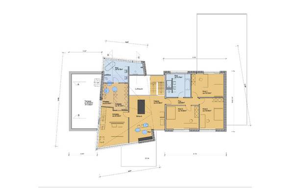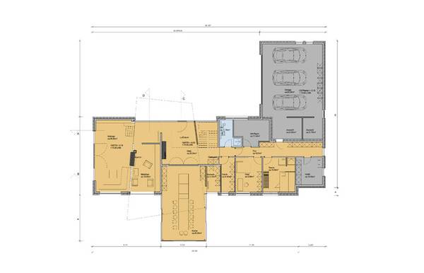 Wohnbereich, Ess- und Kochbereich, Elternbereich, Kinderbereich und Garage sind in verschiedenen, formal differenzierten Kuben untergebracht und in der Mitte durch eine Glasfassade zusammengefasst. Der Eingangsbereich erhält seine Überdachung durch das mit vorbewittertem Zink verkleidete Elternhaus. Es ist gekennzeichnet durch sein abgeschrägtes Dach und an die Dachform angepassten Lichtöffnungen, die diesem Nutzungsbereich einen schwebenden Eindruck oberhalb der Eingangszone verleihen.