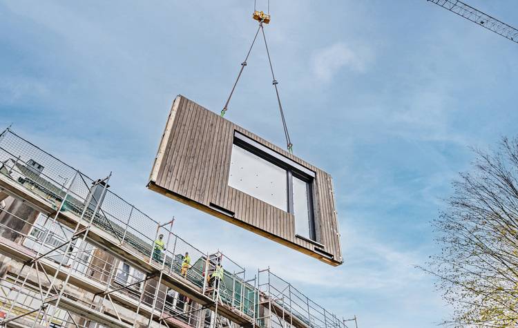 Im Anschluss werden die maßgeschneiderten Elemente per Tieflader zur Baustelle transportiert und am Gebäude montiert (Abb. 4). Ebenfalls vorgefertigt sind Haustechnikmodule, die vor Ort nur noch angeschlossen werden müssen. Auch in die Fassadenelemente integrierte TGA-Lösungen sind möglich.