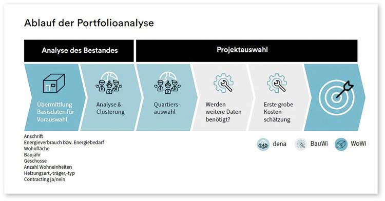 Die Einschätzung, welche Teile eines Portfolios für eine serielle Sanierung infrage kommen, erfordert Expertise und Erfahrung. Das Energiesprong-Team der Dena unterstützt Wohnungsunternehmen und Bestandshalter bei der Portfolioanalyse und der Ermittlung passender Gebäude. Das Ergebnis der seriellen Sanierungsanalyse lässt sich problemlos in bereits bestehende CO2-Roadmaps integrieren. Diese Leistung ist wie alle anderen Beratungs-, Informations-, und Veranstaltungsangebote kostenlos (Abb. 1).