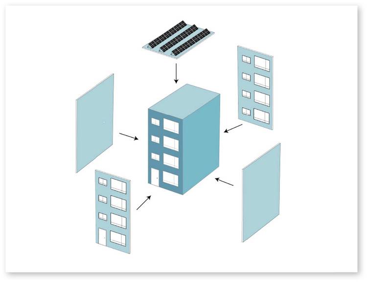 Die millimetergenaue Vermessung der zu sanierenden Gebäude per 3-D-Laserscan und Drohnentechnik bildet den Startpunkt eines Projekts. Aus den verdichteten Messdaten wird ein BIM-Modell generiert. Dieser digitale Zwilling dient als Planungsgrundlage für die Produktentwicklung und Vorfertigung der Dach-, Fassaden- und Technikmodule. Die Fassadenelemente werden inklusive Dämmung, Fenstern, Lüftung, Leerrohren und gewünschter Oberfläche im Werk passgenau in gleichbleibend hoher Qualität vorgefertigt.