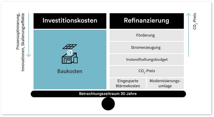 Im Vergleich zur konventionellen energetischen Modernisierung eröffnet das serielle Sanieren erheblich mehr Kostensenkungspotenziale. In Kombination mit Förderprogrammen auf Bundes- und Landesebene ergibt sich daraus ein attraktiver Business-Case für die Wohnungswirtschaft. Ziel des Energiesprong-Prinzips ist es, dass sich Sanierungsinvestitionen größtenteils über eingesparte Energie- und Instandhaltungskosten refinanzieren (Abb. 3). Hinzu kommen weitere kostensenkende Faktoren wie eingesparte CO2-Kosten, Planungssicherheit, höhere Qualität, eine schnellere Umsetzung und Wertsteigerung. Perspektivisch werden die Kosten für serielle Sanierungslösungen durch Automatisierung, Digitalisierung, Prozessoptimierung und Skaleneffekte weiter sinken.