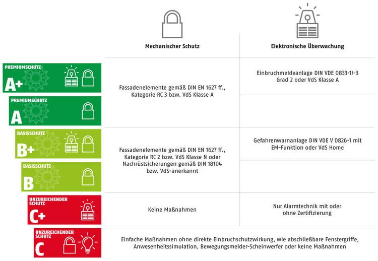 Die Skala des K-Einbruch-Levels reicht von A+ (Premium-Einbruchschutz) über B (Einbruchschutz) bis C (unzureichender Schutz).