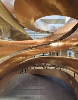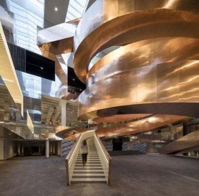 Ein besonderes Highlight ist der neu entstandene Eingangsbereich des Gebäudekomplexes, dessen Blickfang eine kupferverkleidete Wendeltreppe im Zentrum ist. Sie windet sich, in der Form an eine sauber abgetrennte Apfelschale erinnernd, vier Stockwerke hinauf.