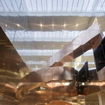 Fällt heute das Sonnenlicht durch die Lichtbänder, wirkt die spektakuläre Installation in der Mitte des Atriums durch das sich im Kupfer reflektierende Licht noch beeindruckender. Zusätzlich verstärkt wird der Effekt durch die mit perforierten Aluminiumplatten verkleideten Wände.