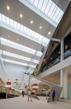 Während der Sanierung wurden in den Bau zwei große Atrien integriert, die nun einen starken visuellen Kontrast zwischen den hellen Gemeinschaftsbereichen und Treppenhäusern sowie den dunklen Ausstellungsräumen bilden. Für viel Tageslicht und eine angenehme Temperaturregulierung durch Frischluftzufuhr entschieden sich Cebra Architects, zwölf Atrium-Lichtbänder aus insgesamt 159 Velux Modular Skylights in die Dächer der beiden Atrien einzubauen.