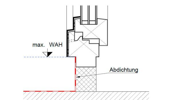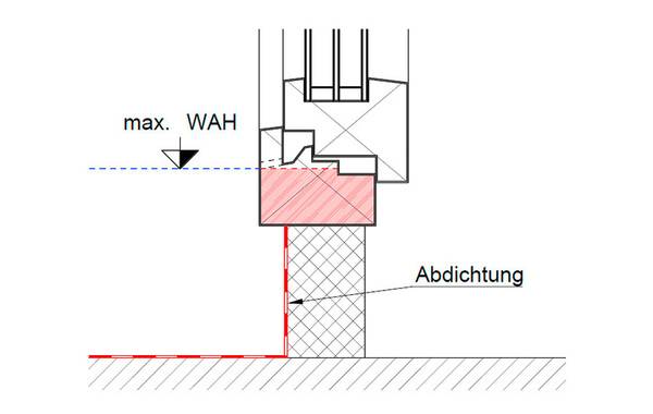 Dazu wurde Folgendes definiert: Die Maximale Wasseranstauhöhe (max. WAH) ist jene Höhe, bis zu der Wasser kurzfristig an Fenster- und Türelemente angestaut werden darf. Kurzfristig heißt in diesem Zusammenhang jene Zeitspanne, in der ein funktionsfähiges Regelentwässerungssystem – z. B. ein Gully bei Starkregen, Unwetter – überstaut werden kann. Die maximale Wasseranstauhöhe wird vom Fensterhersteller für seine Fensterkonstruktion festgelegt.