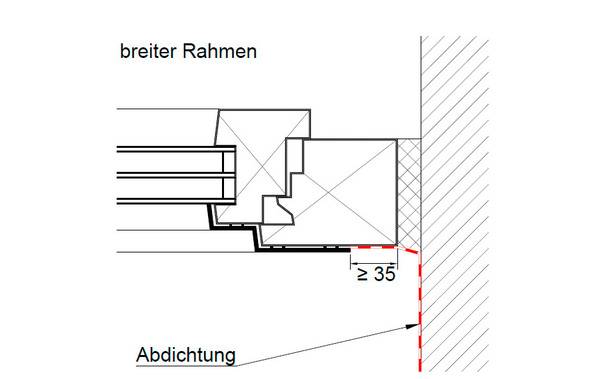 Um die Abdichtung überhaupt dauerhaft anschließen zu können, sind die Voraussetzungen für den Abdichter zu schaffen. Die Mindestanschlussbreiten für den Anschluss der Abdichtung am Fenster- oder Türelement betragen unten horizontal mind.