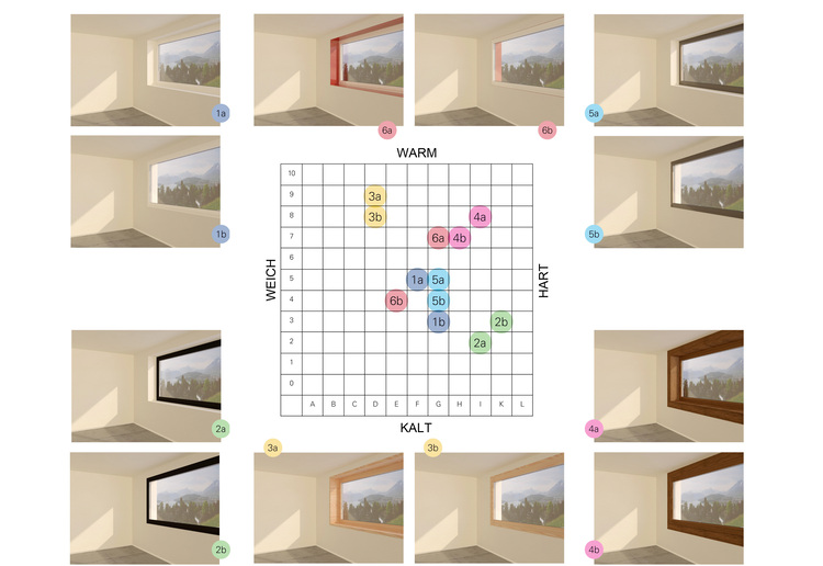 - Rahmenfarben mit rot/braun Anteilen bewirken den „wärmsten“ Raumeindruck (Abbildung Fenster 3a/3b sowie 4a/4b und 6a).