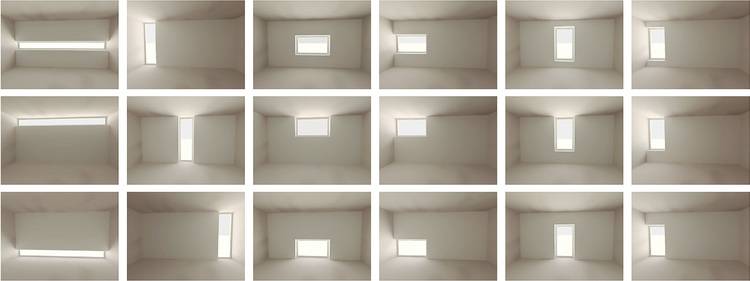 Die zweite Versuchsanordnung fokussiert das Fensterformat und die Fensterposition im Raum. Wiederum wurden über das digitale Befragungstool Anfragen zur Beurteilung versandt. Der Augpunkt befindet sich diesmal in nahezu frontaler Position zum Untersuchungsobjekt auf Augenhöhe beim Betreten des Raumes. Die Fensteröffnungsgröße wurde gemäß den gesetzlichen Vorschriften auf 10% der Bodenfläche des 15 m2 großen Raumes festgelegt. Die zu untersuchenden Variablen der Öffnungsarten bildeten einerseits das Format (hoch oder quer) und die Position (decken- oder bodenbündig, links, rechtsseitig oder mittig). Wobei dreierlei Formatvarianten getestet wurden: Ein Format mit den Kantenlängen im goldenen Schnitt, eines mit langgezogenem Querformat von Wand zu Wand, sowie eines mit Hochformat von Boden bis Decke.