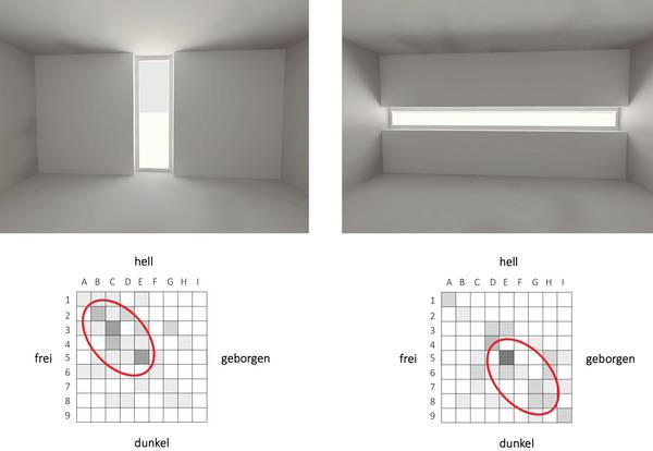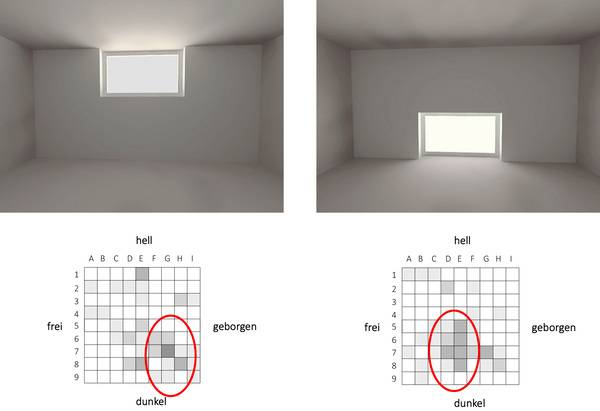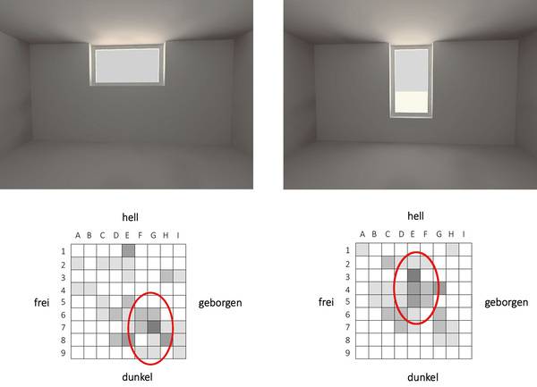 Interessantes offenbart auch der Vergleich der oberen und unteren Fensterposition: Obwohl sie in der Tendenz gleich hell wirken, schneidet das an der oberen Raumkante positionierte Fenster „geborgener“ ab und dies bei allen Fensterformaten. Es wird vermutet, dass der stärkere visuelle Abschluss auf der Höhe des Körpermittelpunktes des Betrachters die größere „geborgene“ Raumwahrnehmung entstehen lässt (Bild 5).