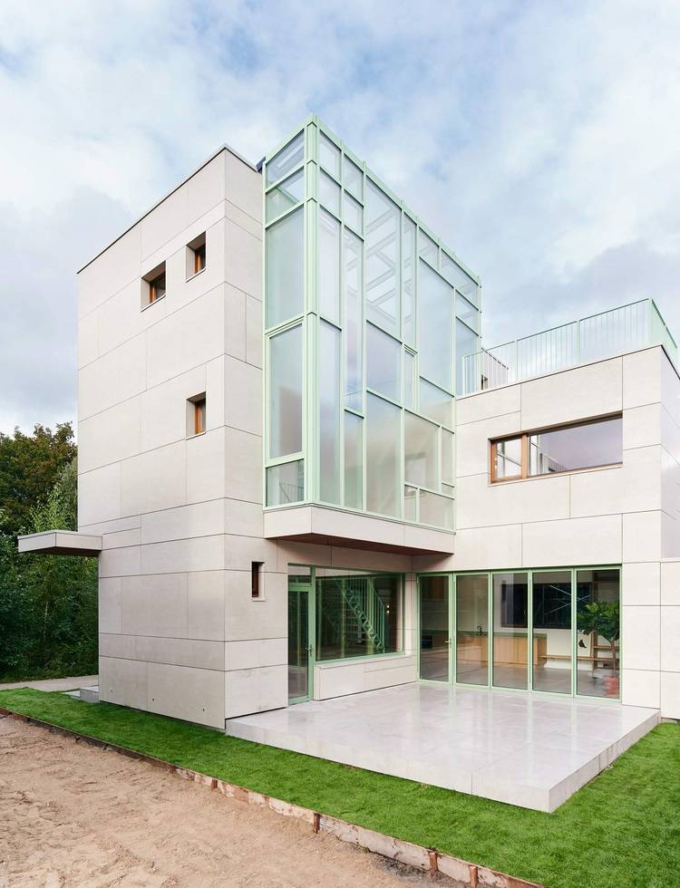 „RAL 6021 Blassgrün“ ist die Farbe, die auf den ersten Blick das 216 m² große Wohndomizil am nördlichen Stadtrand von Amsterdam dominiert. Das zarte und freundliche Hellgrün findet sich im und am ganzen Haus wieder: In den Rahmen der Fenster und Türen, in den Profilen der großen Glas-Faltwand zwischen Wohnzimmer und Sonnenterrasse sowie in der hervorspringenden Glasfassade auf der Gebäuderückseite, hinter der sich die Treppenkonstruktion aus hellgrünem Stahl verbirgt.