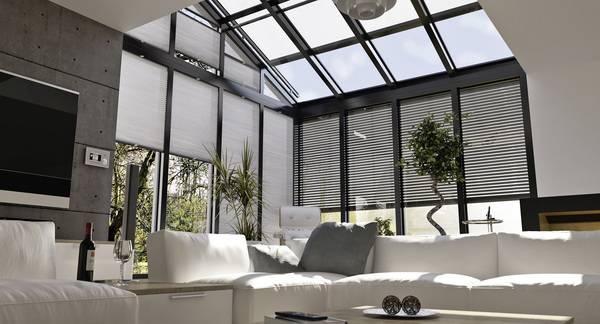 Eine Kombination von innen- und außenliegenden Systemen kann aber auch bedeuten, dass je nach Himmelsrichtung unterschiedliche Produkte eingesetzt werden können. Typische Lösungen sind z. B. Wintergärten, bei denen nach einer Seite nur der Sichtschutz gefragt ist, während auf der Dachfläche eine Wintergartenmarkise eingesetzt wird, damit der Wintergarten bei Sonne überhaupt benutzt werden kann.