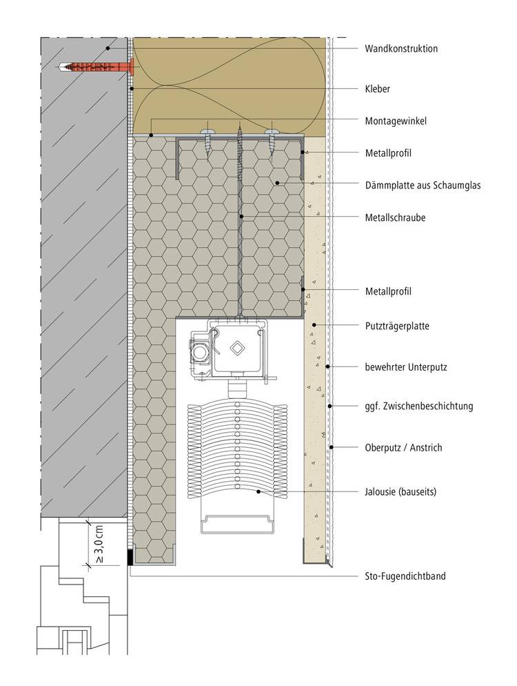 - StoElement JAS aus EPS als Jalousieschürze mit Kunststoffinnenverkleidung ohne Mauerwerksdämmung.