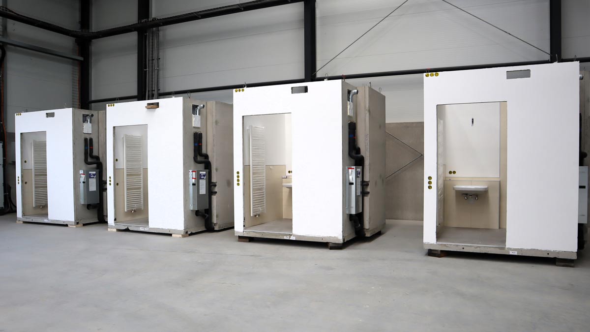 Die komplexen Herausforderungen der Sanitärgewerke löste Dennert mit 26 komplett vormontierten und werkseitig gefliesten Badmodulen, die in den Rohbau eingesetzt wurden und lediglich noch an die Gebäudetechnik angeschlossen werden mussten. „Der serielle Ansatz ist die Antwort auf den Fachkräftemangel, auch die aufwendige Koordination verschiedener Gewerke wie Estrich, Trockenbau, Fliesen, TGA-Installation, Sanitär und Malerarbeiten entfällt“, betont Wolfgang Dempert von Dennert.