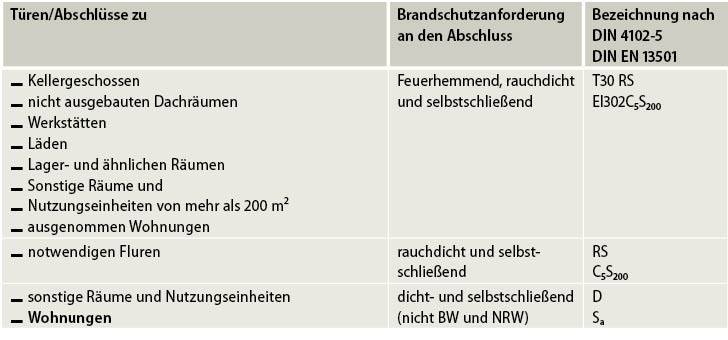 Die Brandschutzanforderungen sind in den Bauordnungen der 16 Bundesländer geregelt. Aufgrund des Föderalismus sind leider nicht alle Regeln gleich – aber wenigstens meistens ähnlich. Die Vorgaben nach der Musterbauordnung der IS-Argebau (Konferenz der für Bau- und Wohnungswesen zuständigen Minister der Länder) sind vielfach Grundlage der länderspezifischen Bauordnung. Die Anforderungen an Wohnungstüren bzw. Türen in Treppenräumen zu Nutzungseinheiten für Gebäude ab der Gebäudeklasse 3 werden in § 35 (6) MBO beschrieben.